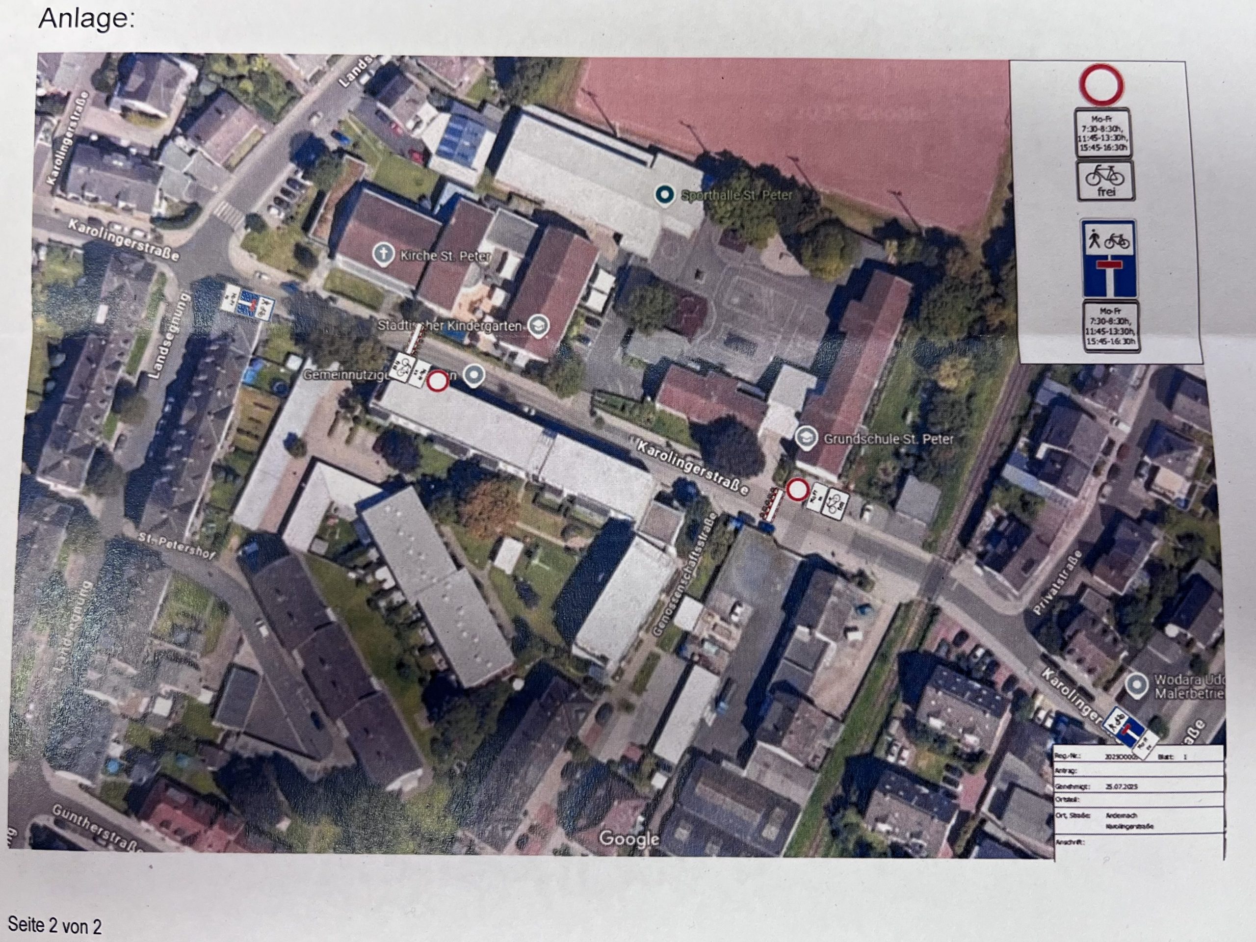 Ab dem 01.09.2025 wird die Karolingerstraße im Bereich vor der Schule zu einer „Temporären Schulstraße“ umgewandelt. Damit möchten wir die Sicherheit unserer Schulkinder im Straßenverkehr erhöhen. Neben einer Beschilderung, die die Einfahrt für Autofahrer und Radfahrer regelt, werden zusätzlich Absperrbarken auf der Höhe unserer Eingangshalle und der Kita Altstadtpänz aufgestellt, die die Einfahrt verhindern. Lediglich die Parkplätze der Schule und des Kindergartens sind für das Personal und Gäste anfahrbar.