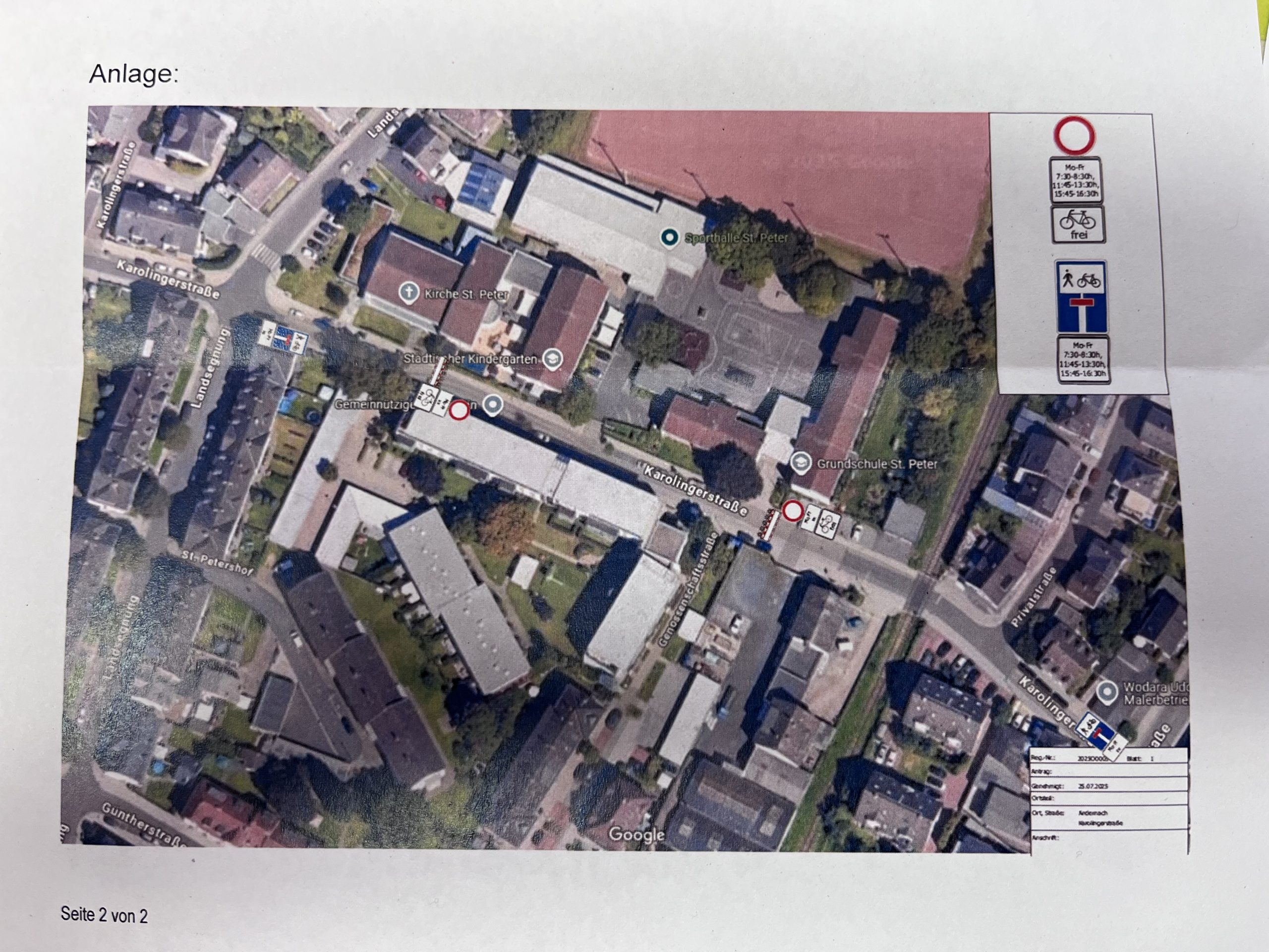 Ab dem 01.09.2025 wird die Karolingerstraße im Bereich vor der Schule zu einer „Temporären Schulstraße“ umgewandelt. Damit möchten wir die Sicherheit unserer Schulkinder im Straßenverkehr erhöhen. Neben einer Beschilderung, die die Einfahrt für Autofahrer und Radfahrer regelt, werden zusätzlich Absperrbarken auf der Höhe unserer Eingangshalle und der Kita Altstadtpänz aufgestellt, die die Einfahrt verhindern. Lediglich die Parkplätze der Schule und des Kindergartens sind für das Personal und Gäste anfahrbar.