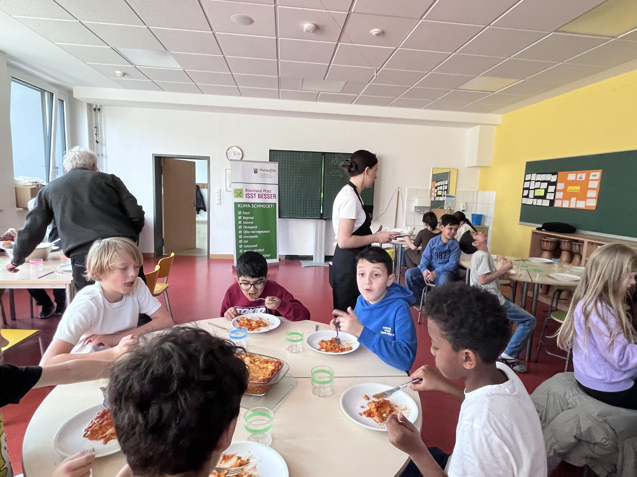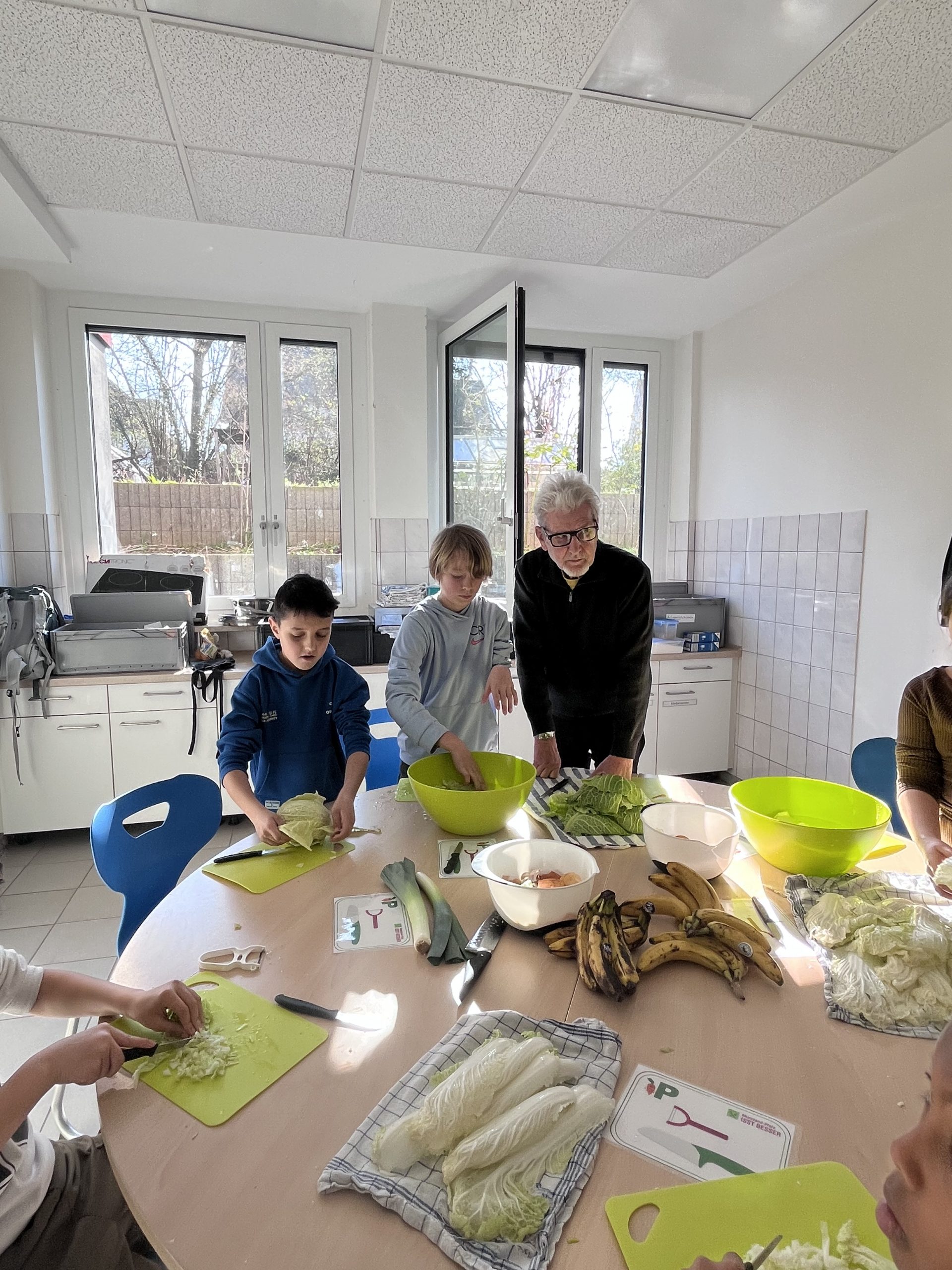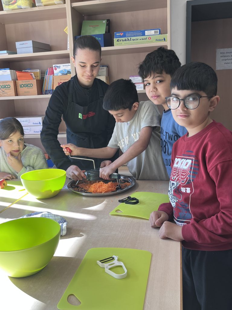 Die Abteilung „Grüne Küche“ hat die Lebensmittel eingekauft und bei der Rezeptauswahl standen regionale, saisonale und vegetarische Lebensmittel im Vordergrund. Mit insgesamt fünf ehrenamtlichen Helfern starteten 20 Kinder voller Begeisterung und bereiteten das Mittagessen gemeinsam zu.