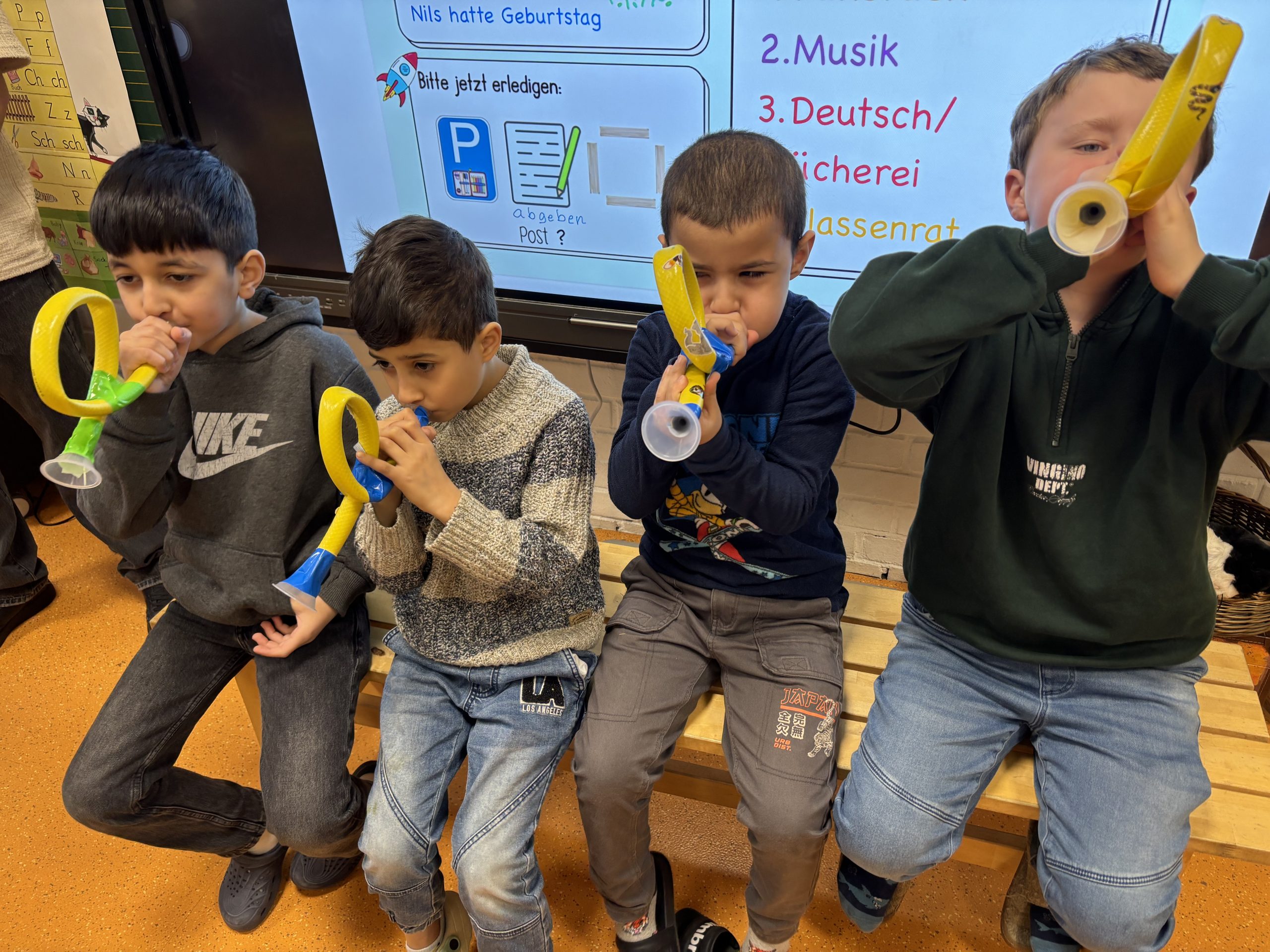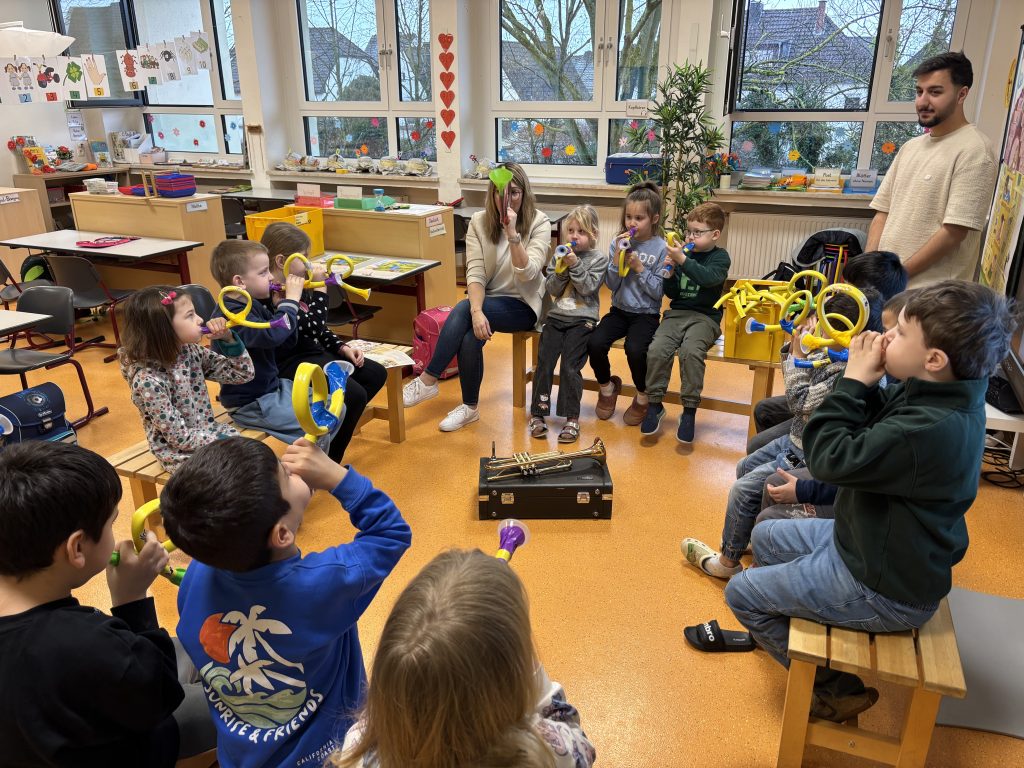 Am 29.1.2026 besuchte Frau Wagner von der Rheinischen Philharmonie die 1. Klassen unserer Grundschule. Mit Leidenschaft und Freude stellte sie den Kindern das Instrument „Trompete“ vor. Sowohl eine echte Trompete als auch die Geschichte „Der Prinz mit der Trompete“ motivierten die Erstklässler, dieses Metallblasinstrument näher kennenzulernen. Richtig spannend wurde es, als alle eine eigene Trompete aus Schlauchstücken und kleinen Trichtern selbst basteln durften. Danach gab es den Rest des Tages viele Töne auf dem Schulhof mit einer Menge Spaß beim Ausprobieren.
