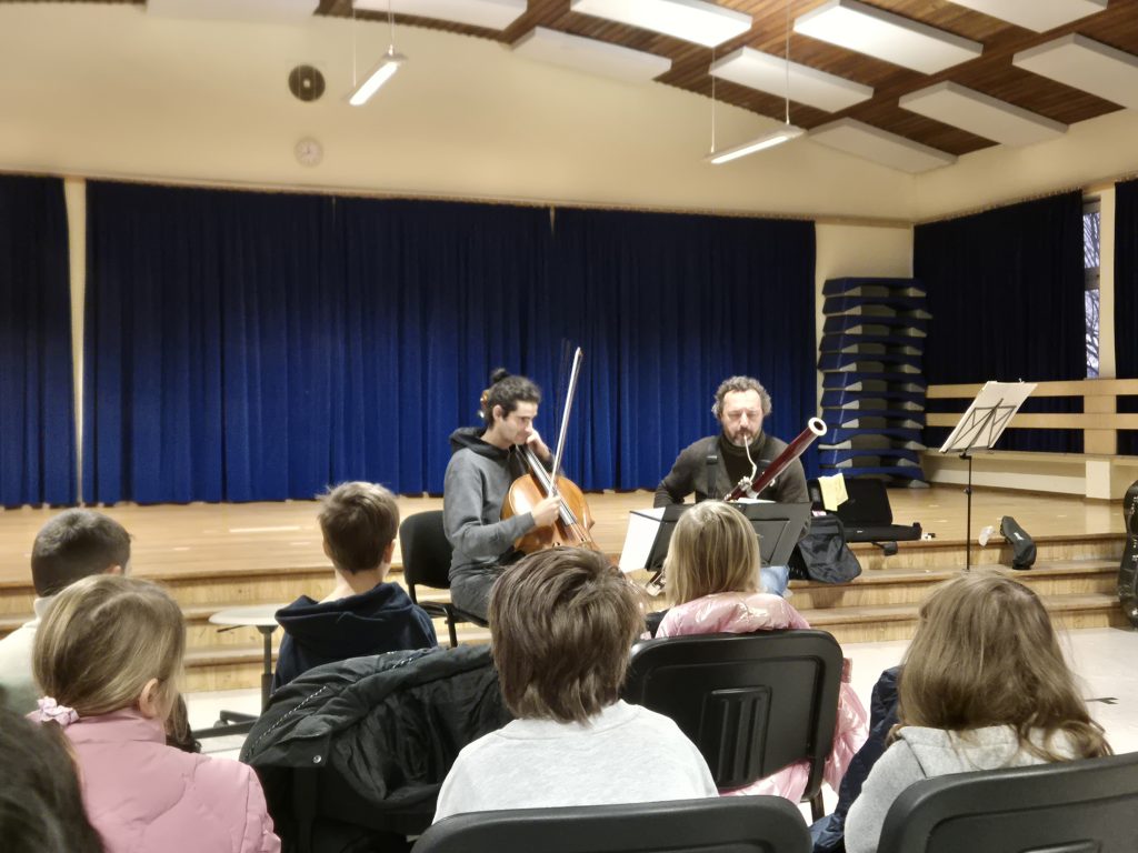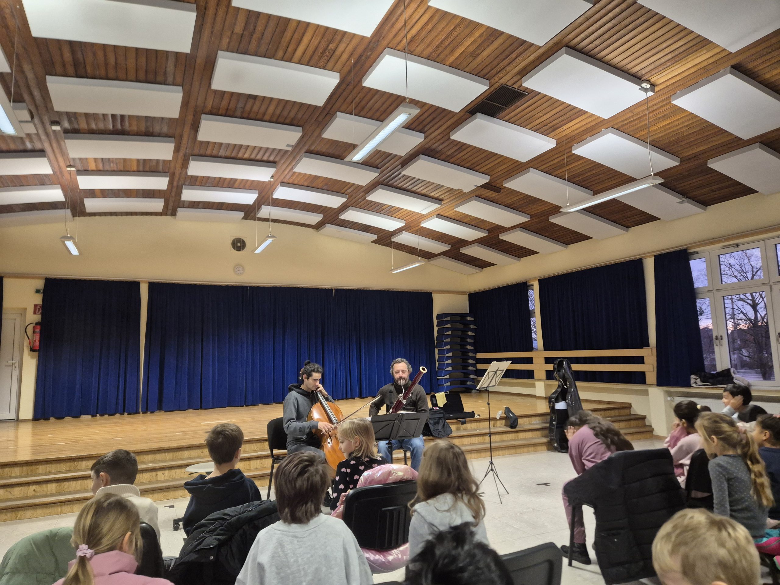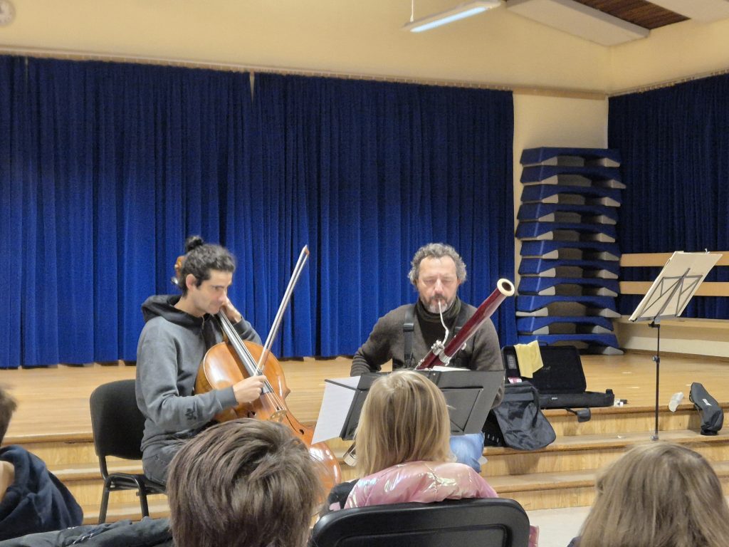 Ein besonderer Vormittag stand kürzlich an unserer Schule an: Zwei Musiker der Rheinischen Philharmonie besuchten die Klassen und verwandelten den Unterricht in ein klingendes Erlebnis. Im Rahmen des Projektes „Musikalisches Klassenzimmer“ bekamen die Schüler und Schülerinnen Gelegenheit, klassische Musik aus nächster Nähe zu erleben und selbst aktiv zu werden.